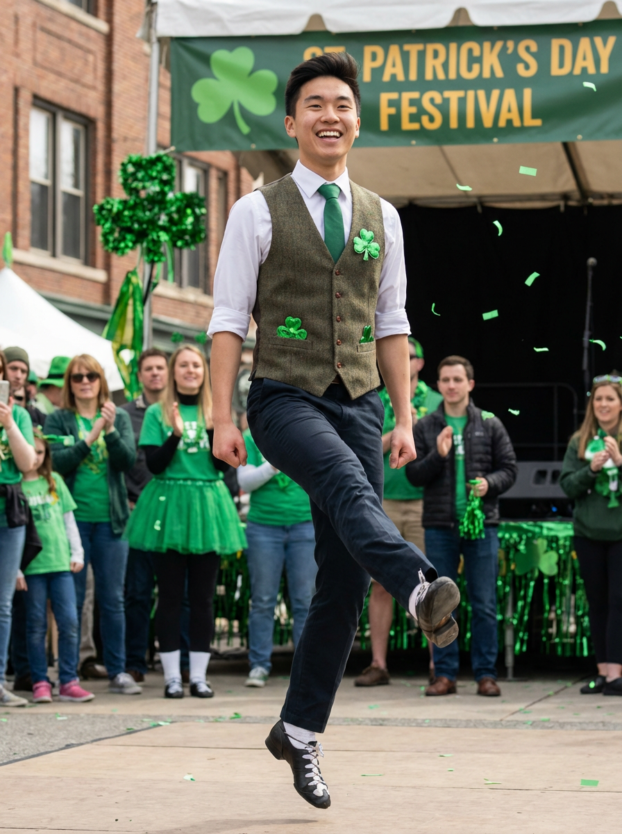 model doing Irish jig dance, St Patricks Day festivities, traditional elements, energetic pose