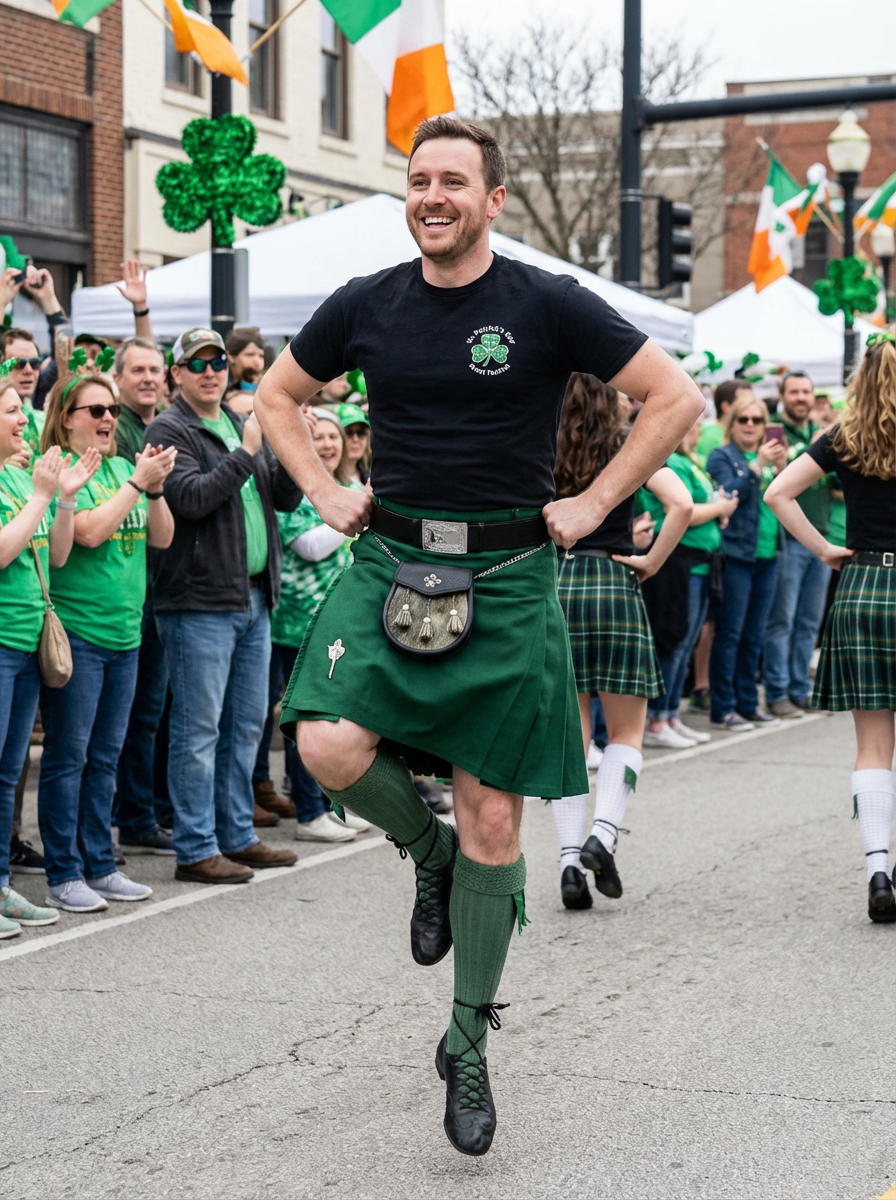 model doing Irish jig dance, St Patricks Day festivities, traditional elements, energetic pose