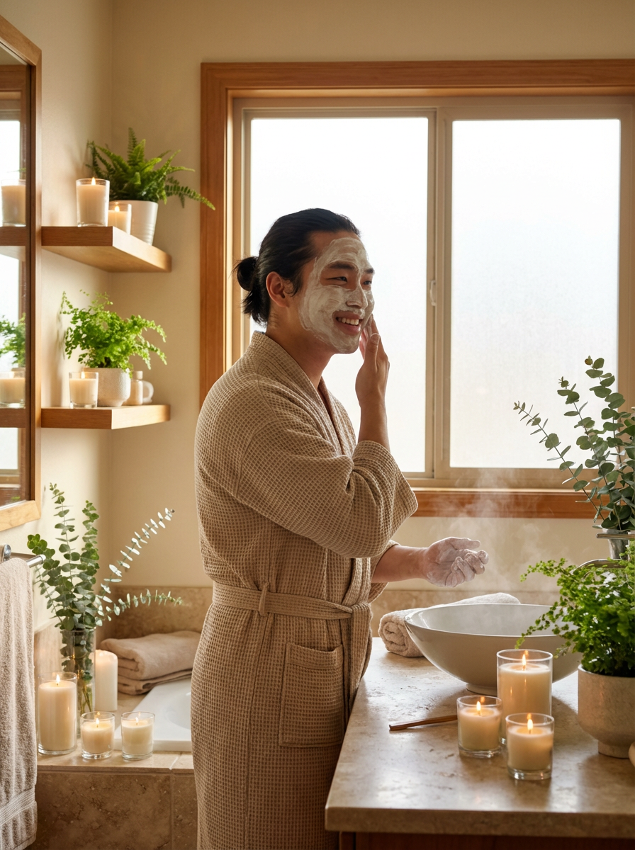 model doing skincare routine in bathroom, wearing soft cotton bathrobe, applying face mask, surrounded by candles and plants, gentle morning light, serene spa-like atmosphere