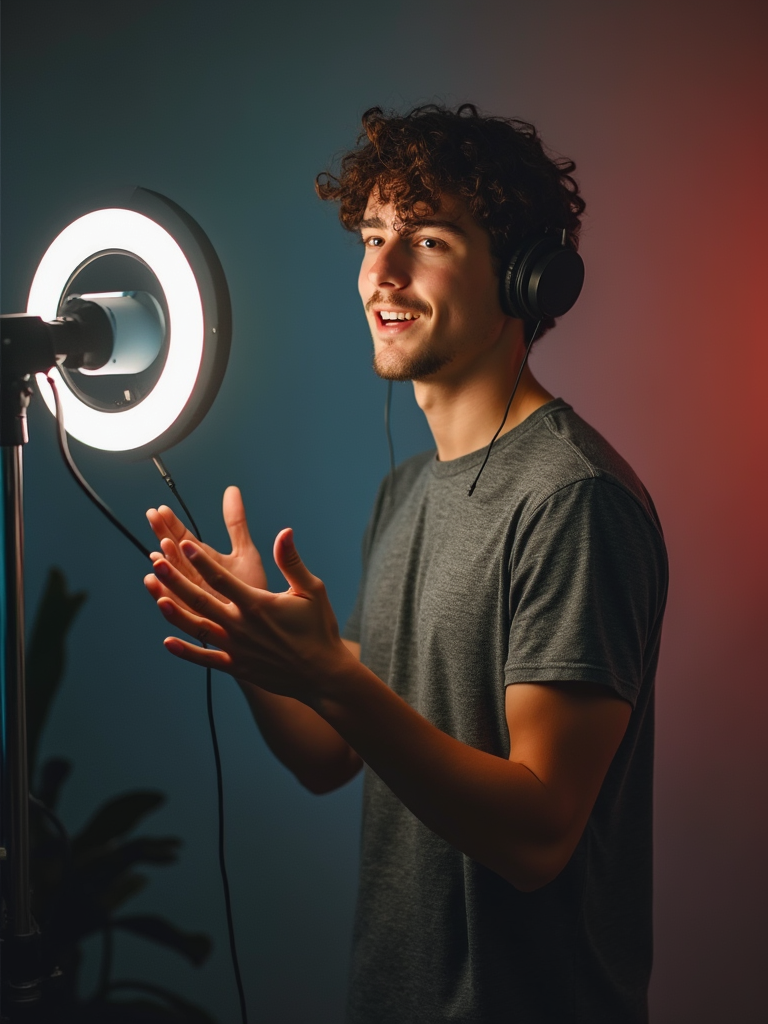 model doing video podcast, wearing presentable casual wear, ring light and camera visible, dual setup for audio and video, modern creator space