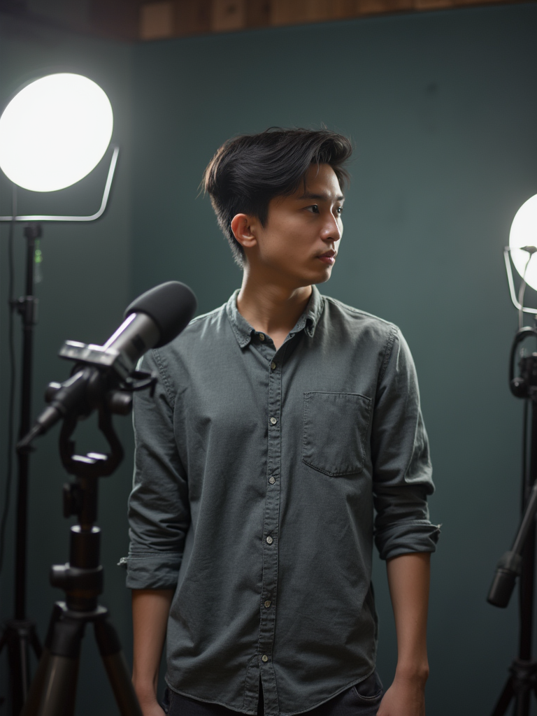 model doing video podcast, wearing presentable casual wear, ring light and camera visible, dual setup for audio and video, modern creator space