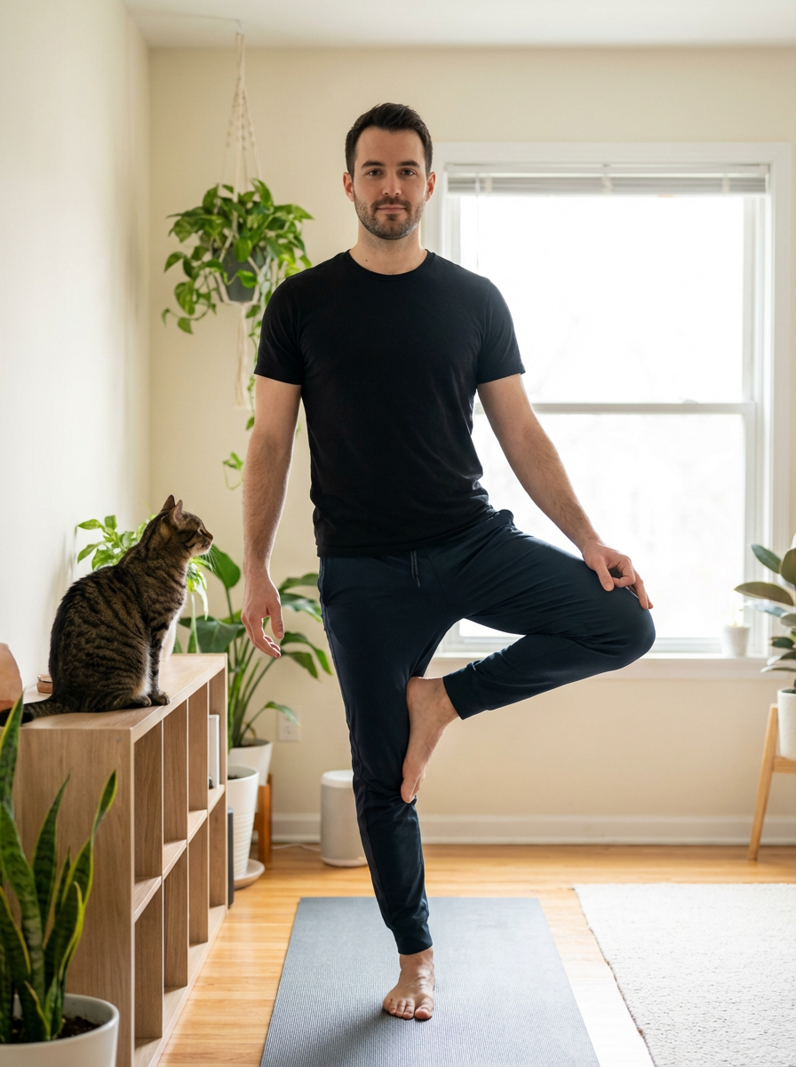 model doing yoga with cat nearby, peaceful home studio, zen atmosphere, curious pet watching