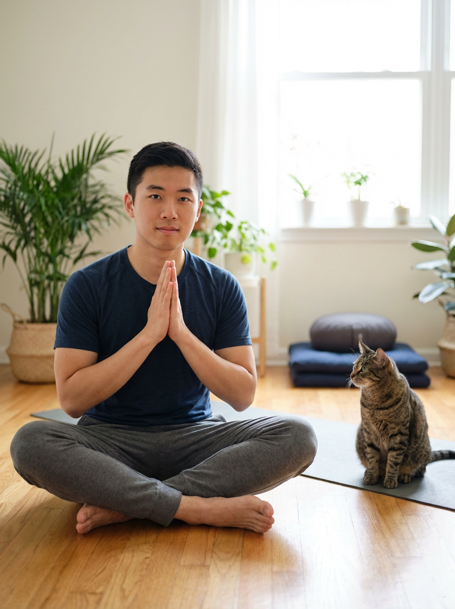 model doing yoga with cat nearby, peaceful home studio, zen atmosphere, curious pet watching