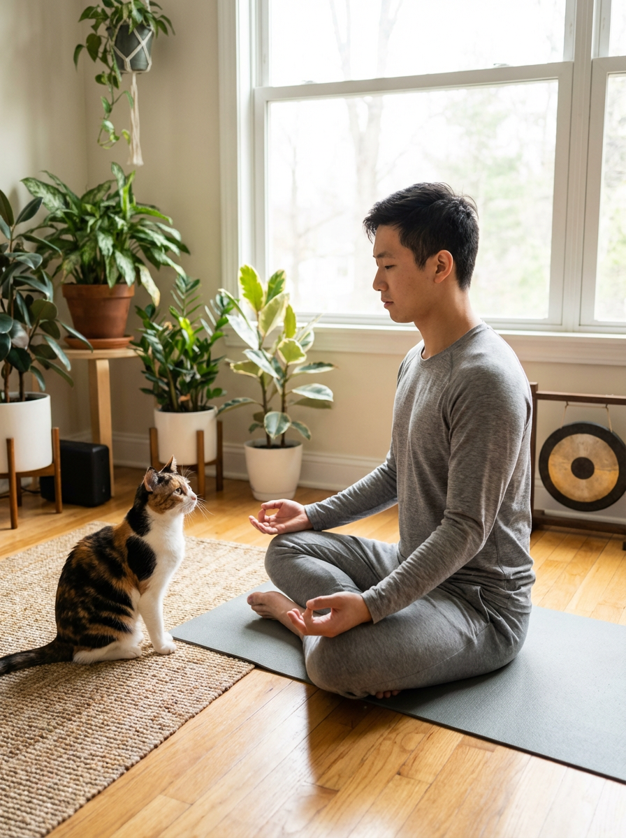 model doing yoga with cat nearby, peaceful home studio, zen atmosphere, curious pet watching