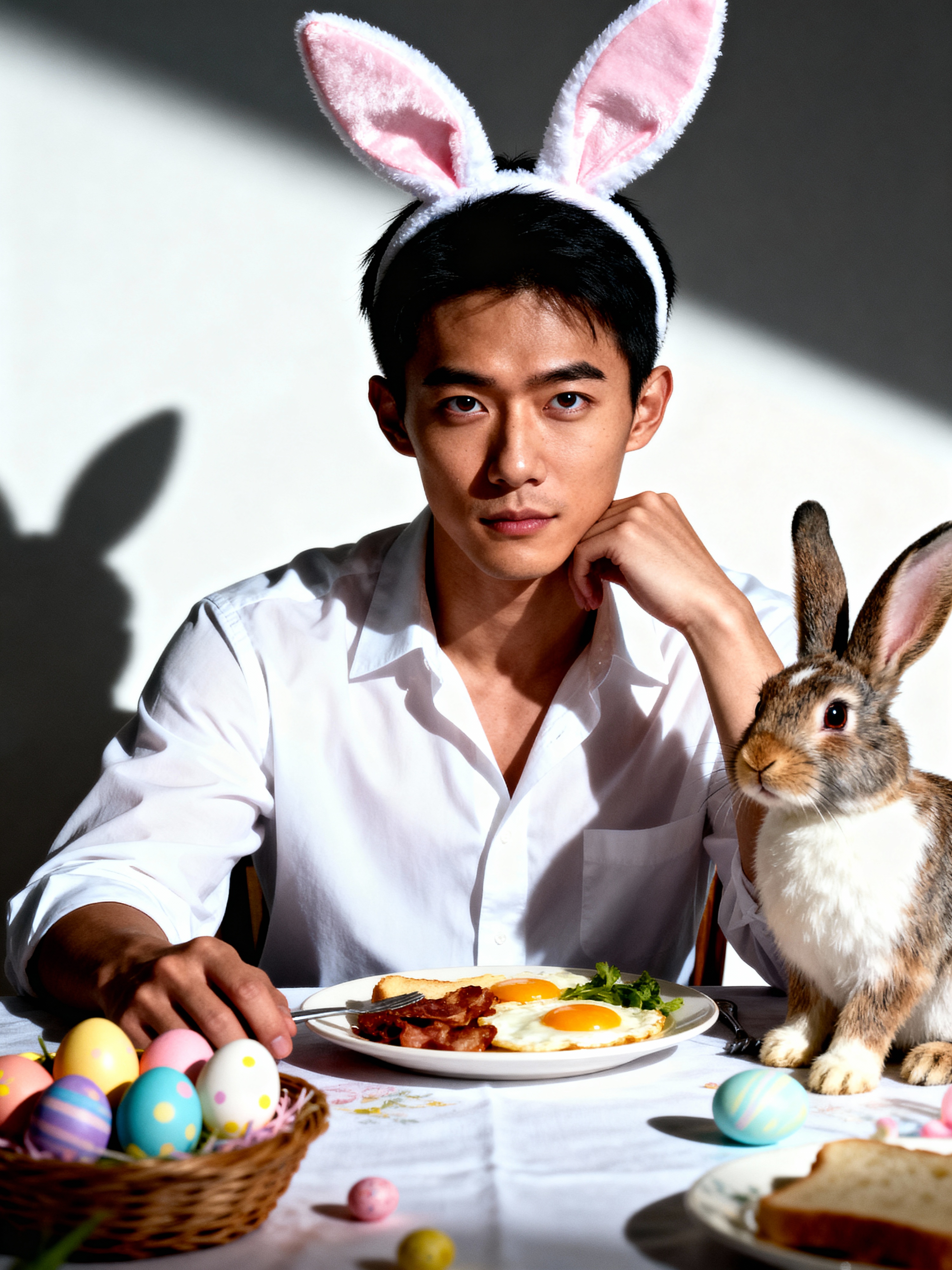 model dressed up for Easter with Easter Bunny Ears at the Easter Breakfast. Easter Eggs. Easter Bunny