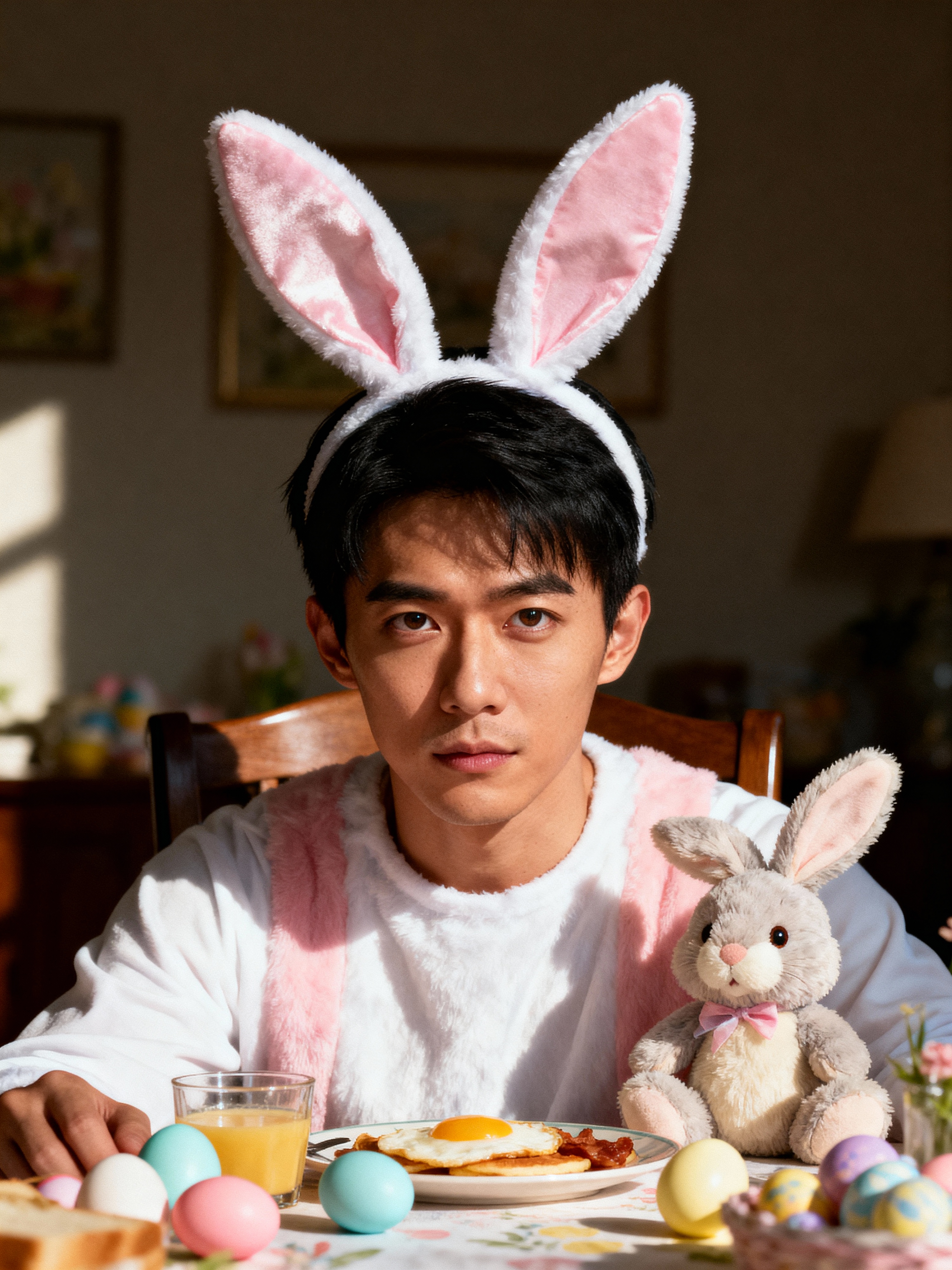 model dressed up for Easter with Easter Bunny Ears at the Easter Breakfast. Easter Eggs. Easter Bunny