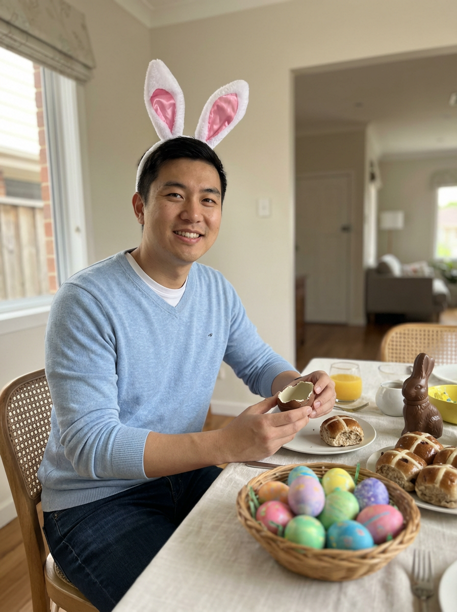 model dressed up for Easter with Easter Bunny Ears at the Easter Breakfast. Easter Eggs. Easter Bunny