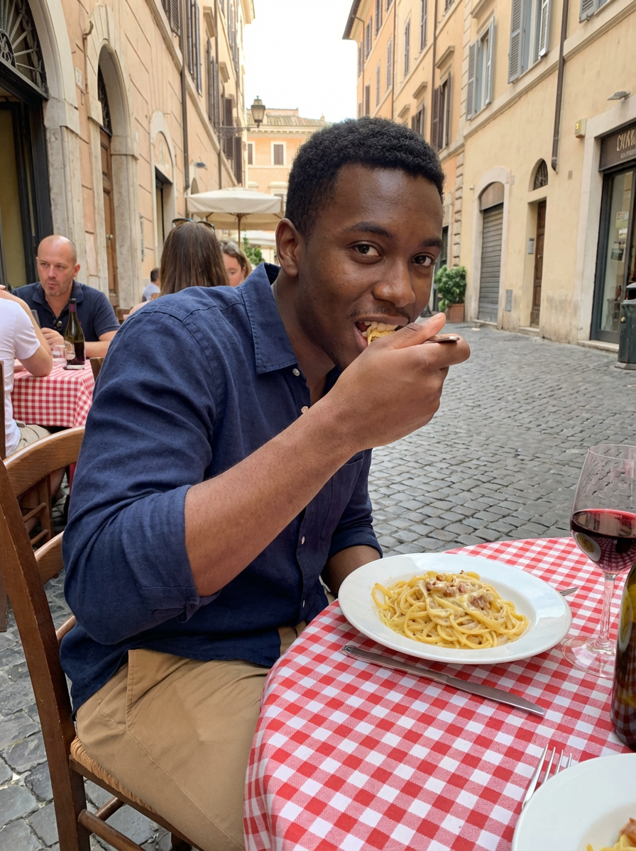 model eating pasta at outdoor trattoria, authentic Roman dining, casual chic style