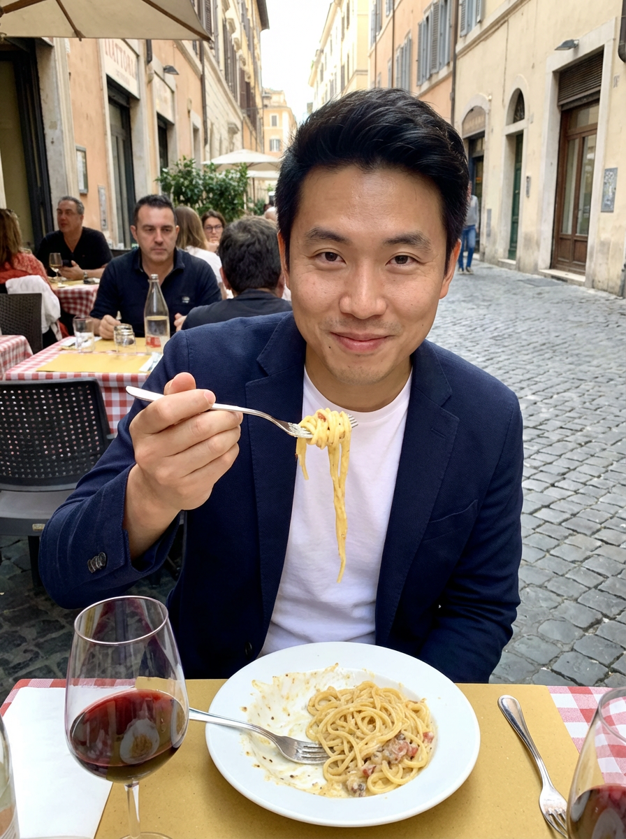 model eating pasta at outdoor trattoria, authentic Roman dining, casual chic style