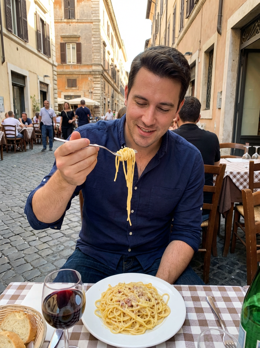 model eating pasta at outdoor trattoria, authentic Roman dining, casual chic style