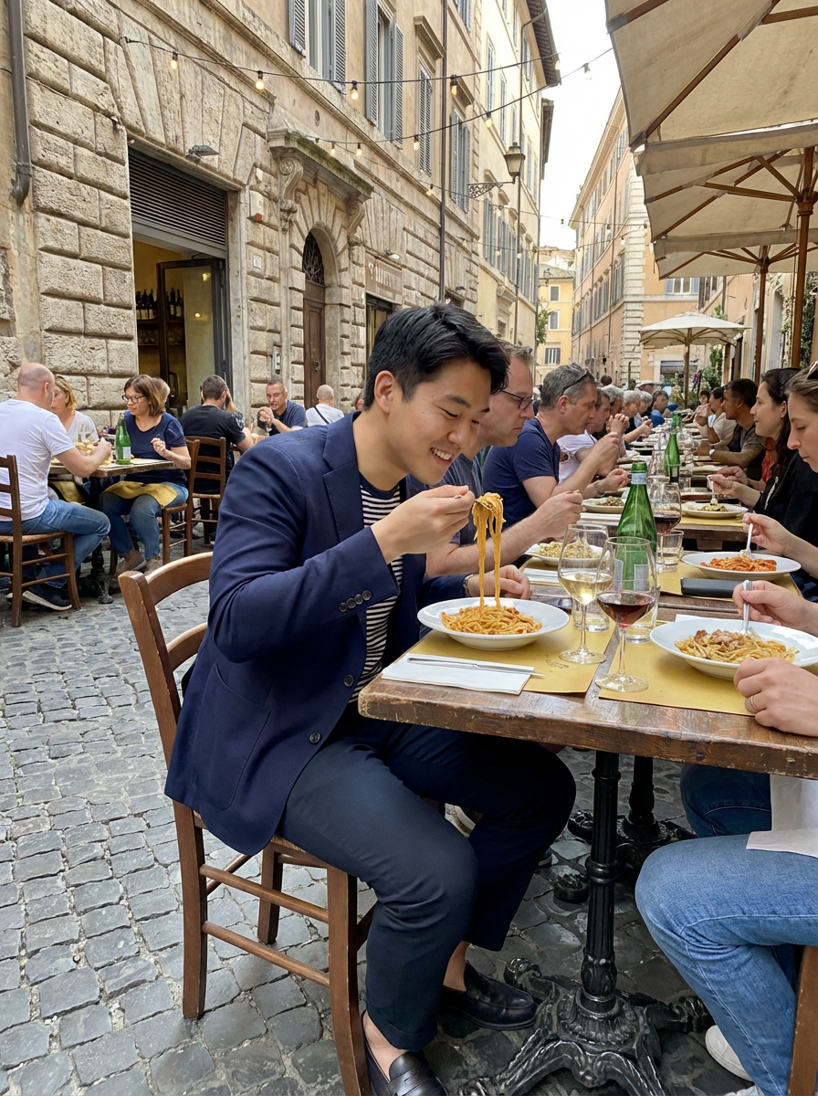 model eating pasta at outdoor trattoria, authentic Roman dining, casual chic style