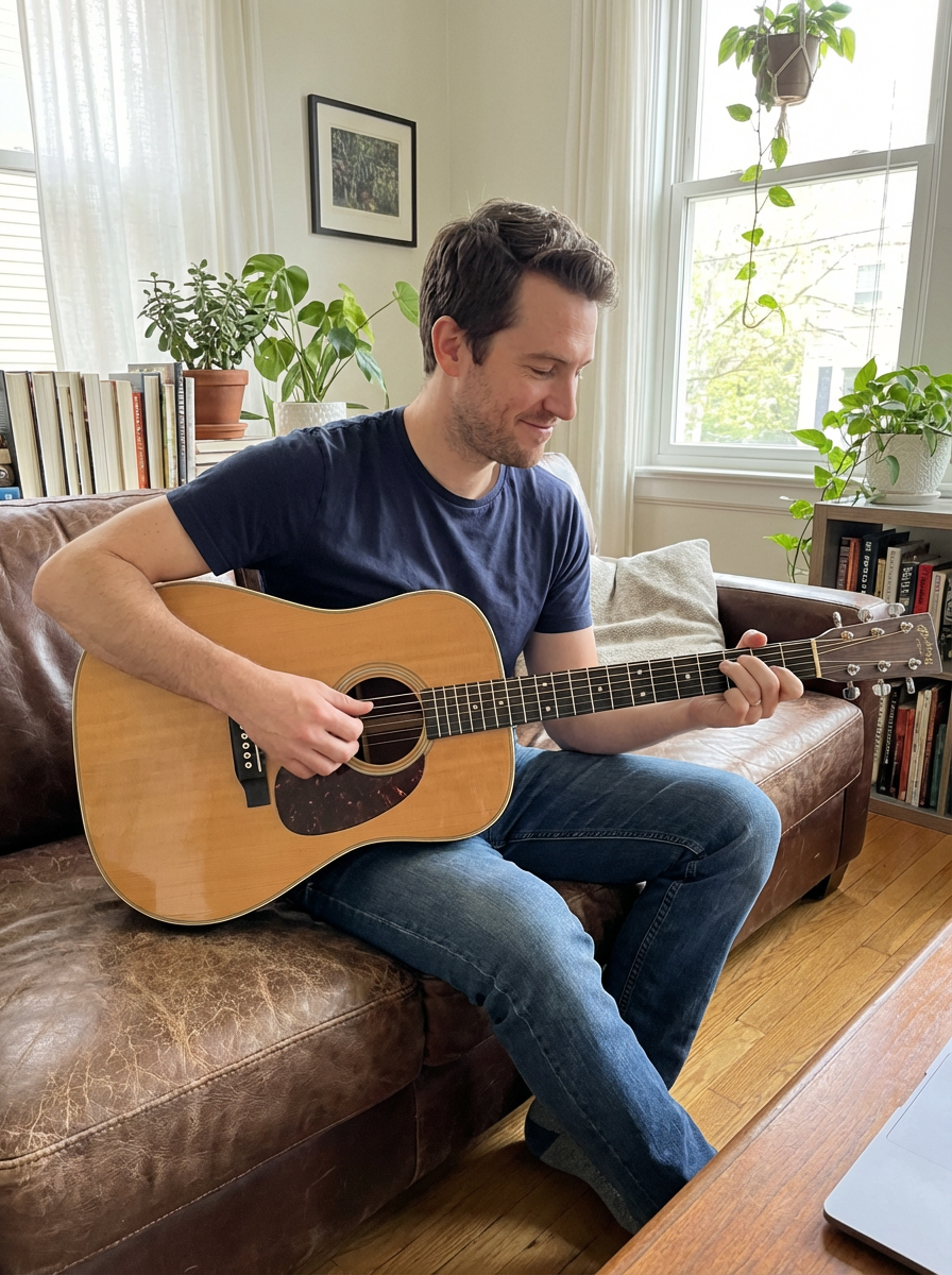 model engaging in hobby, playing guitar, cooking, or gaming, genuine candid moment