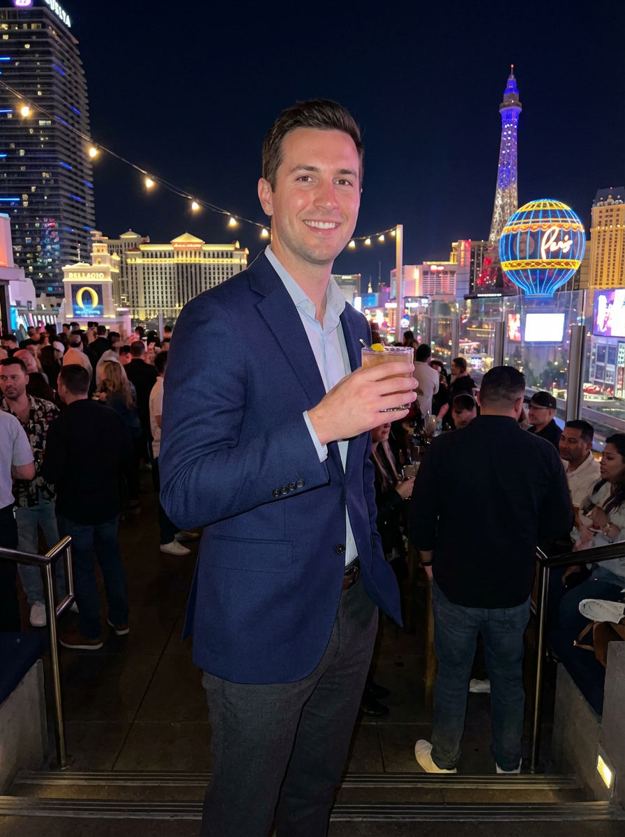 model enjoying a night out at a rooftop bar with views of the Las Vegas skyline. at night. the model wears atailored blazer and trousers.