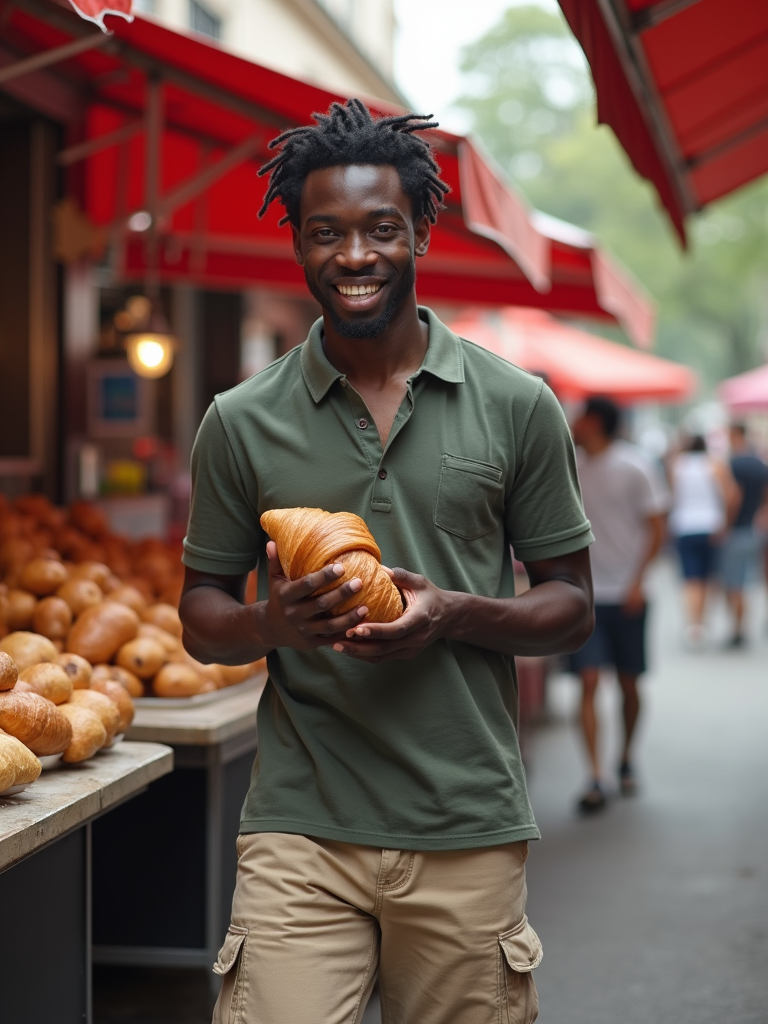 model enjoying street food at a Parisian market, wearing cargo shorts and a polo shirt, holding a croissant
