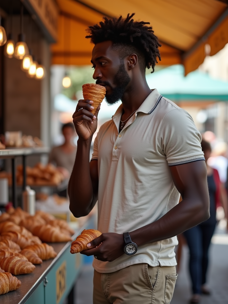 model enjoying street food at a Parisian market, wearing cargo shorts and a polo shirt, holding a croissant