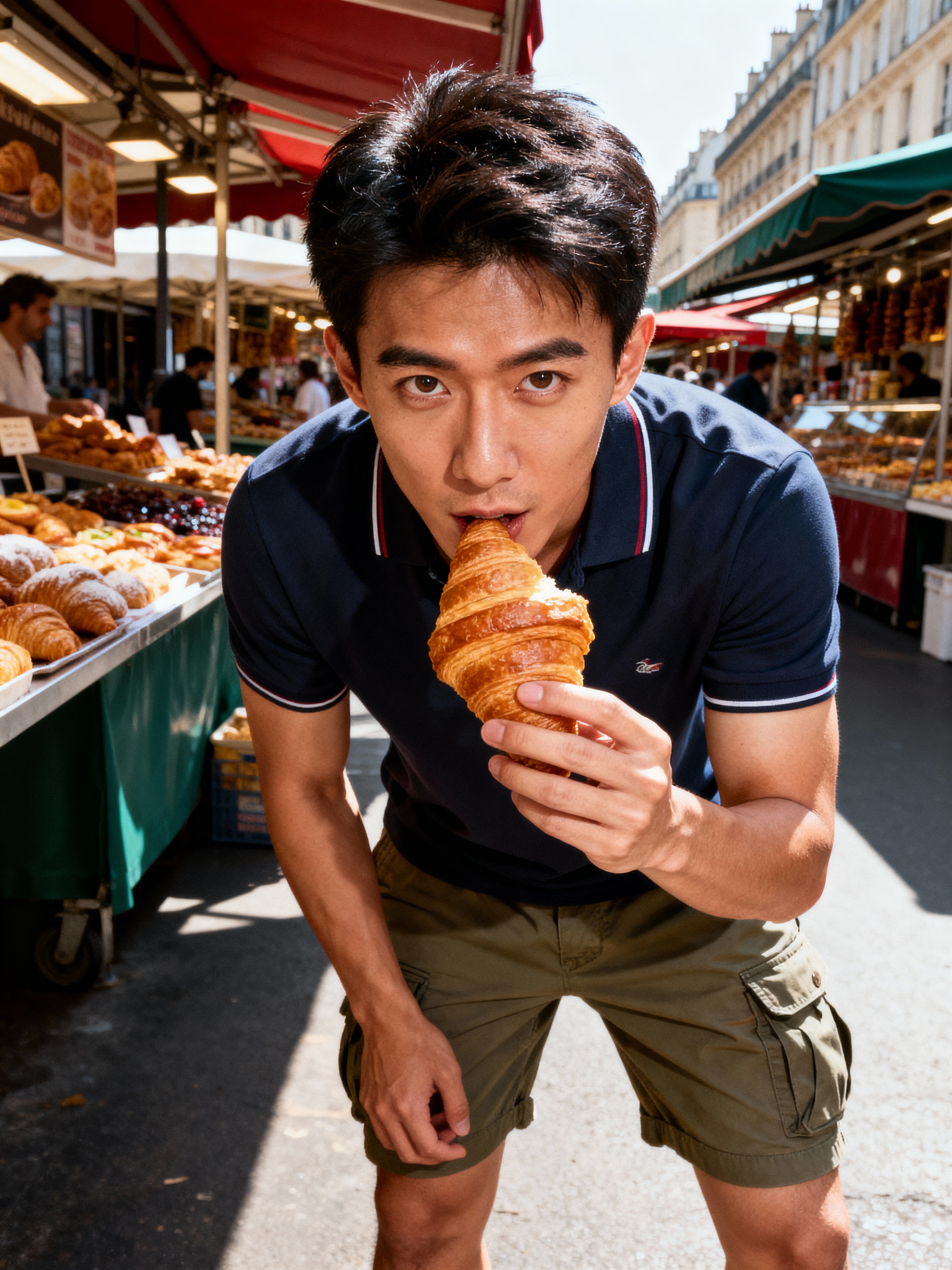 model enjoying street food at a Parisian market, wearing cargo shorts and a polo shirt, holding a croissant