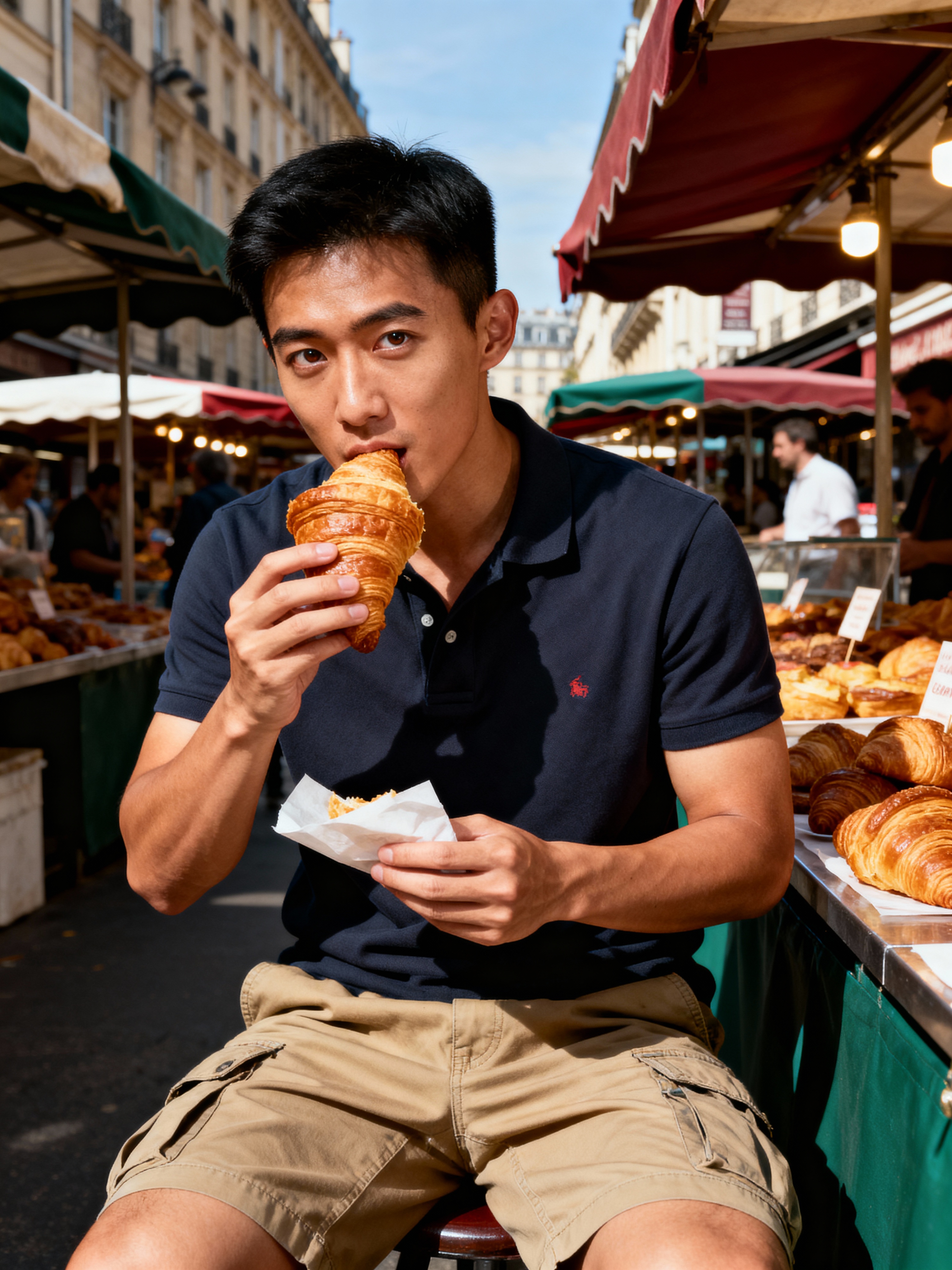model enjoying street food at a Parisian market, wearing cargo shorts and a polo shirt, holding a croissant