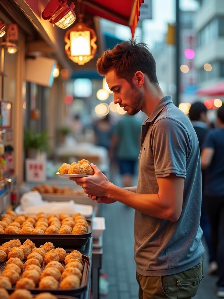 model enjoying street food at Tsukiji Outer Market, wearing cargo shorts and a polo shirt, holding takoyaki