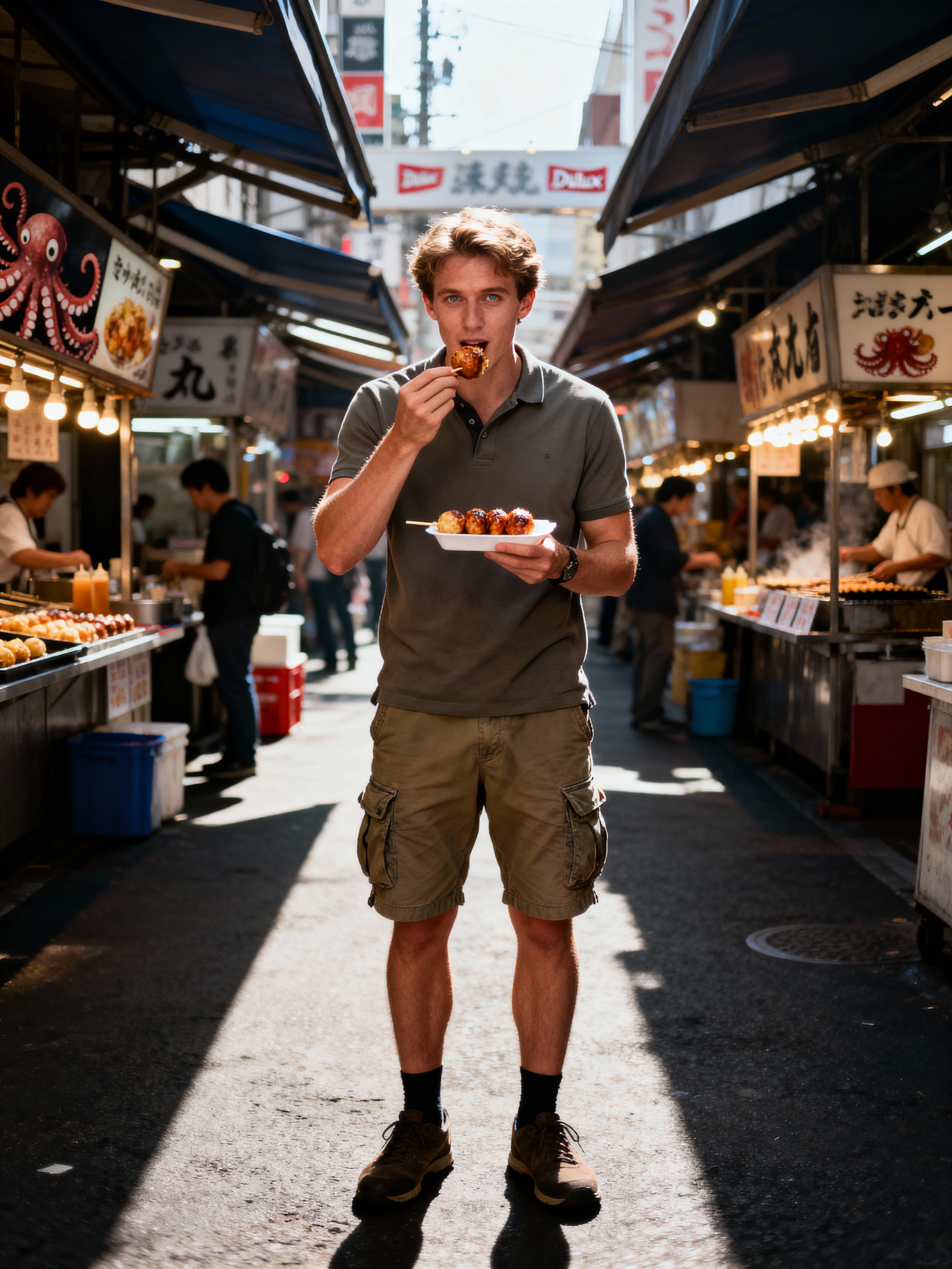 model enjoying street food at Tsukiji Outer Market, wearing cargo shorts and a polo shirt, holding takoyaki