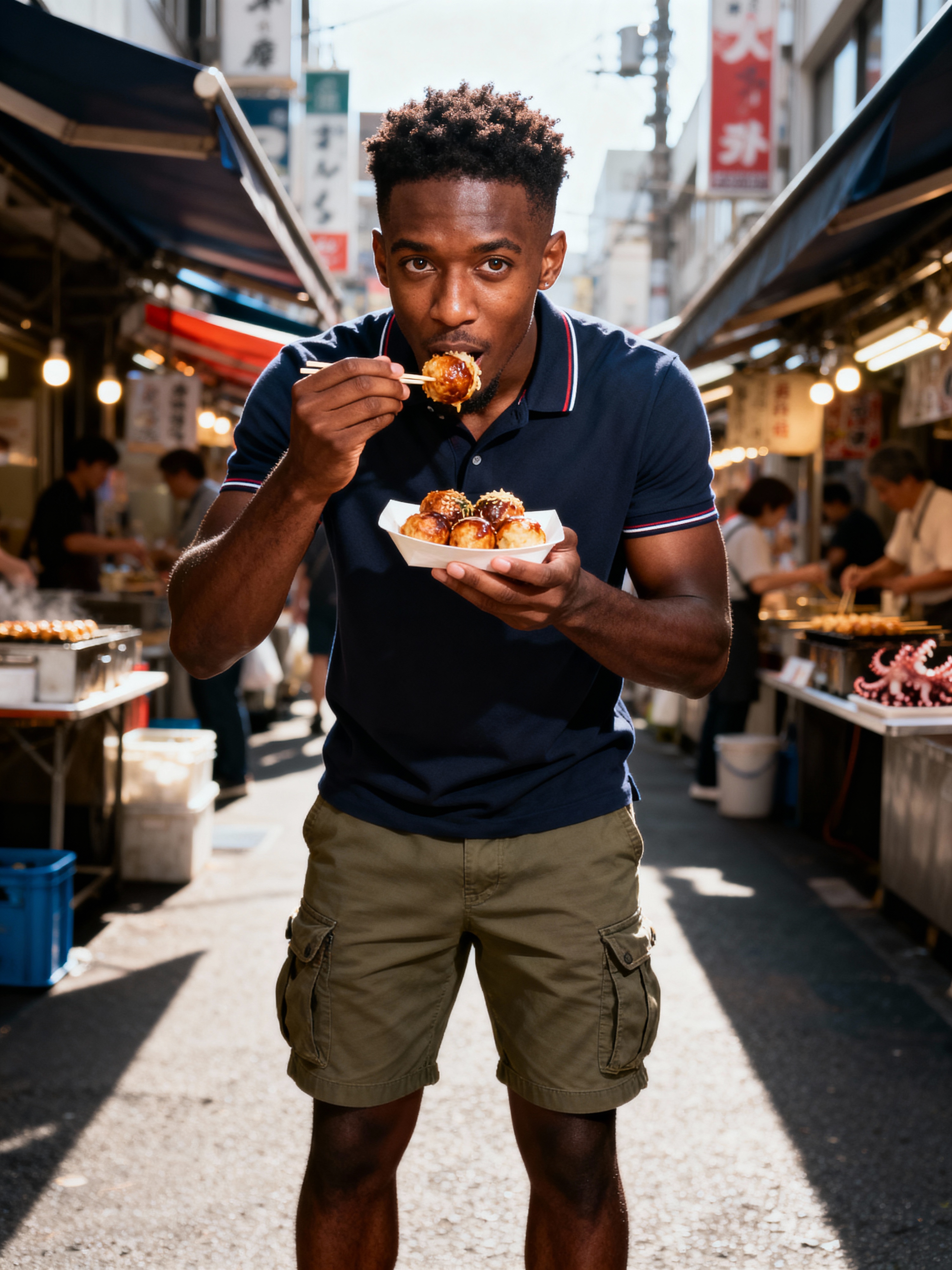 model enjoying street food at Tsukiji Outer Market, wearing cargo shorts and a polo shirt, holding takoyaki
