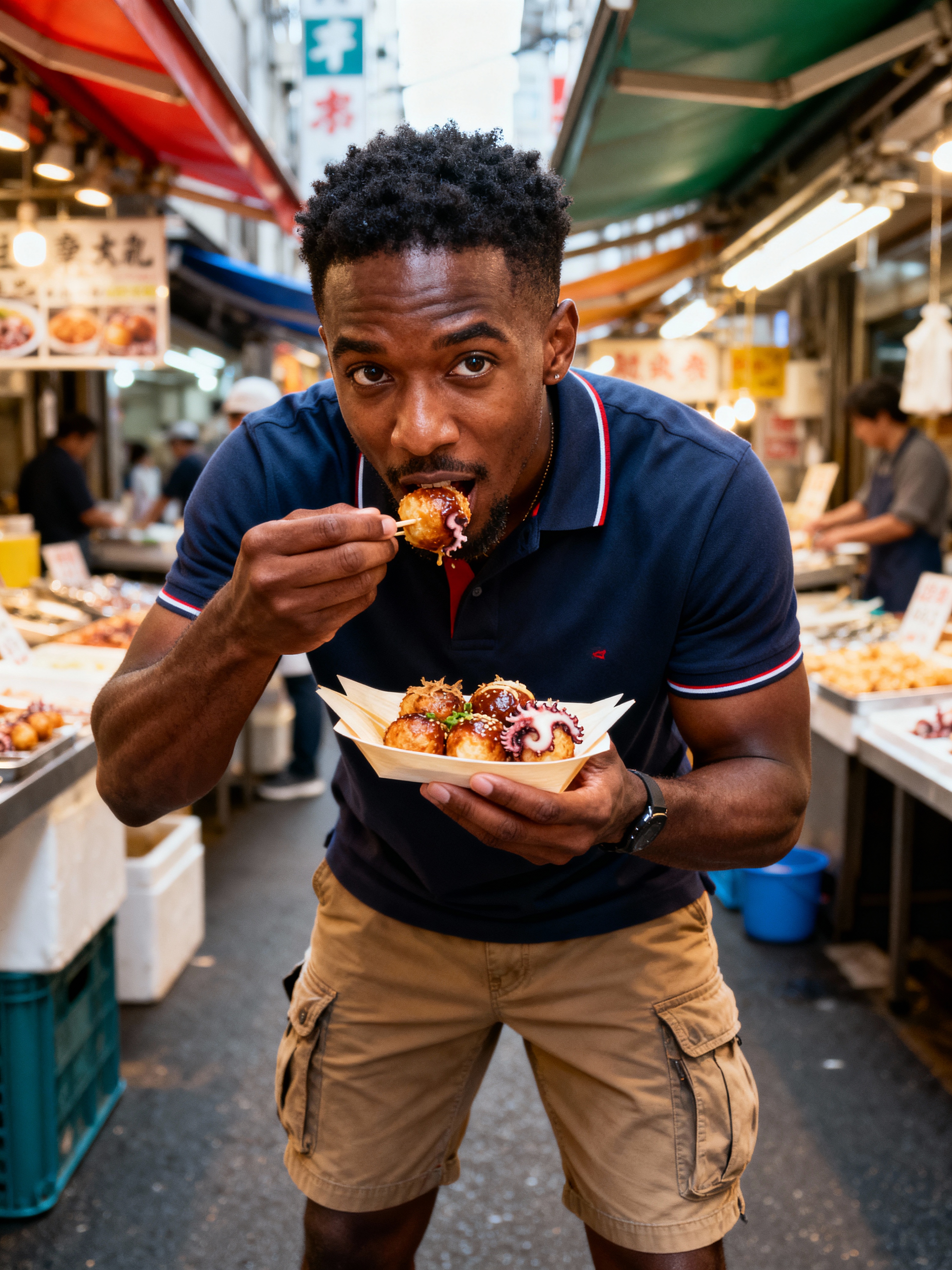 model enjoying street food at Tsukiji Outer Market, wearing cargo shorts and a polo shirt, holding takoyaki