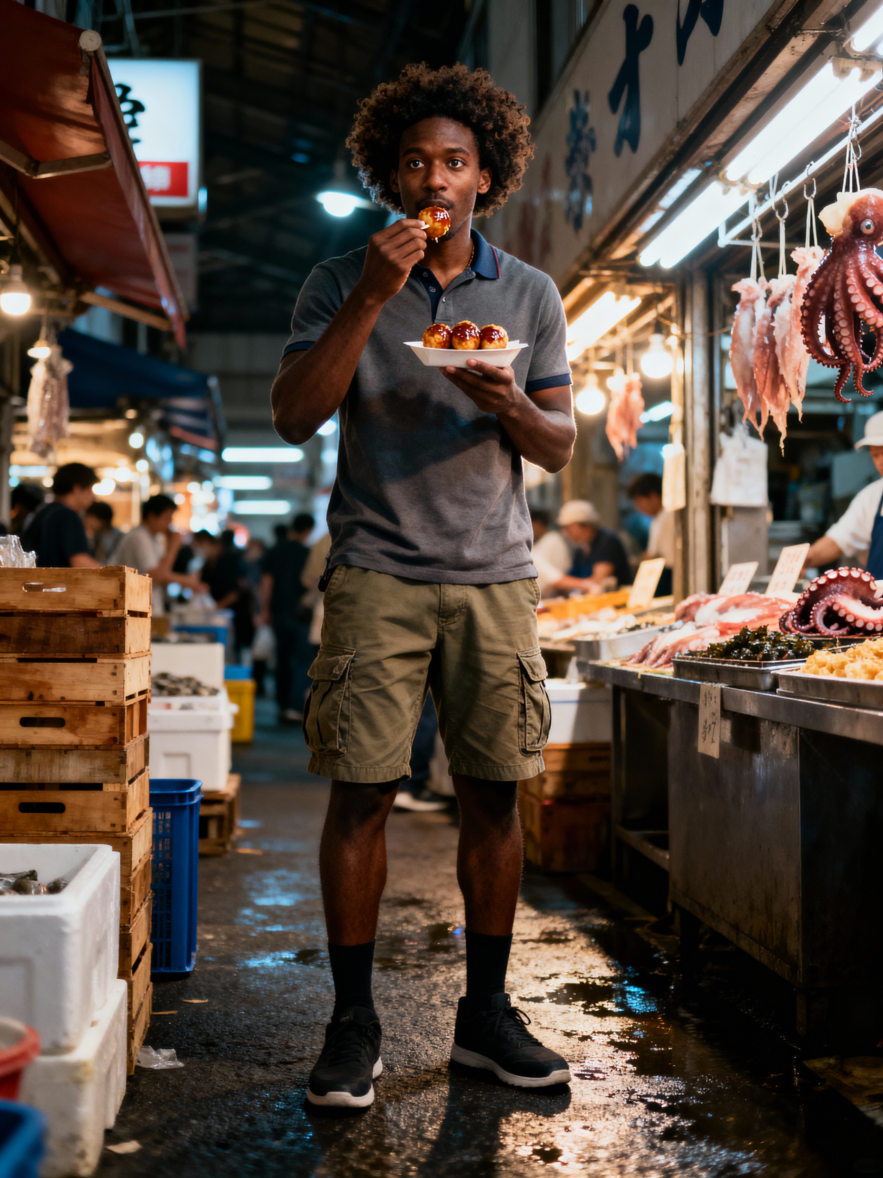 model enjoying street food at Tsukiji Outer Market, wearing cargo shorts and a polo shirt, holding takoyaki