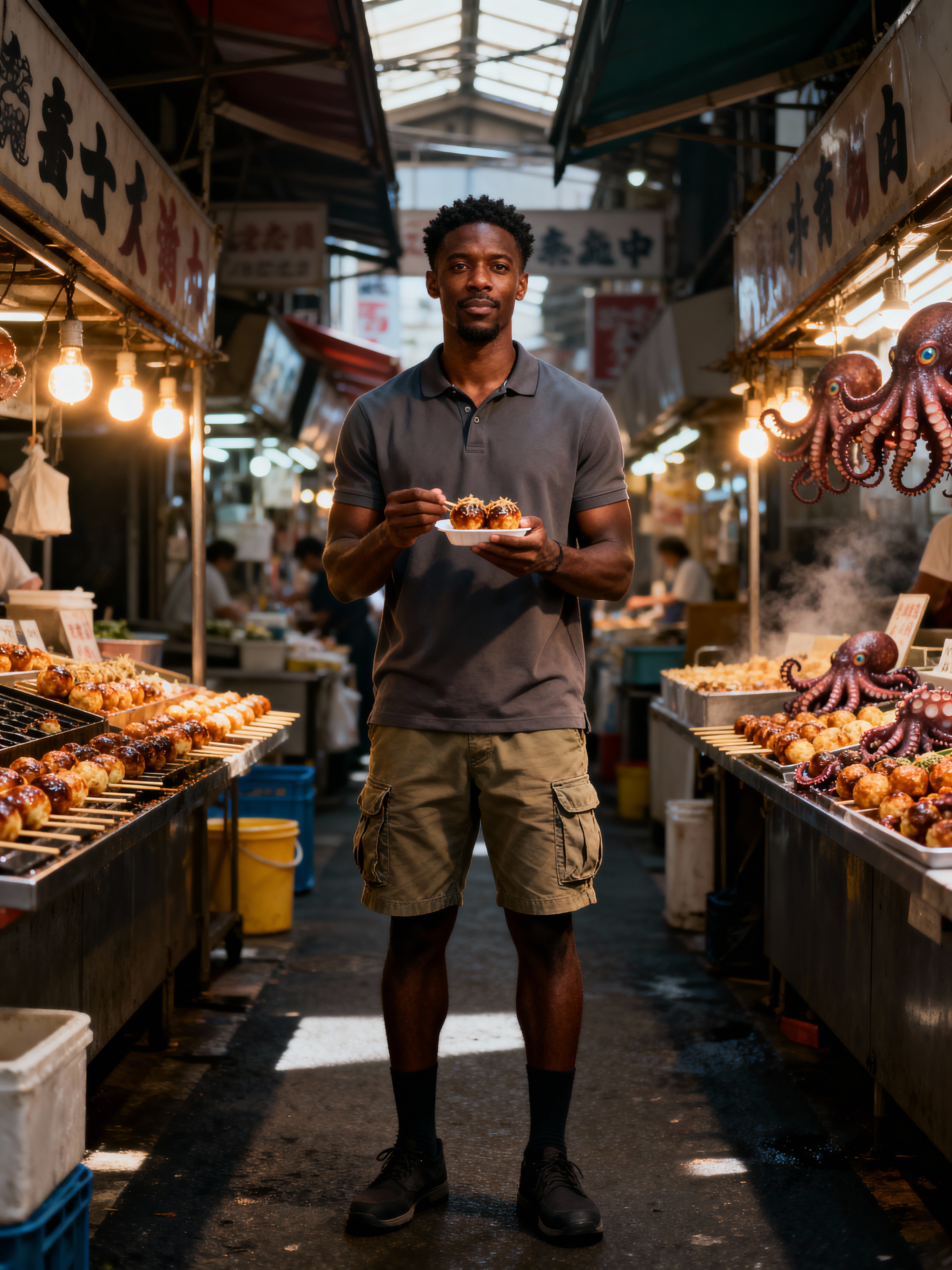 model enjoying street food at Tsukiji Outer Market, wearing cargo shorts and a polo shirt, holding takoyaki
