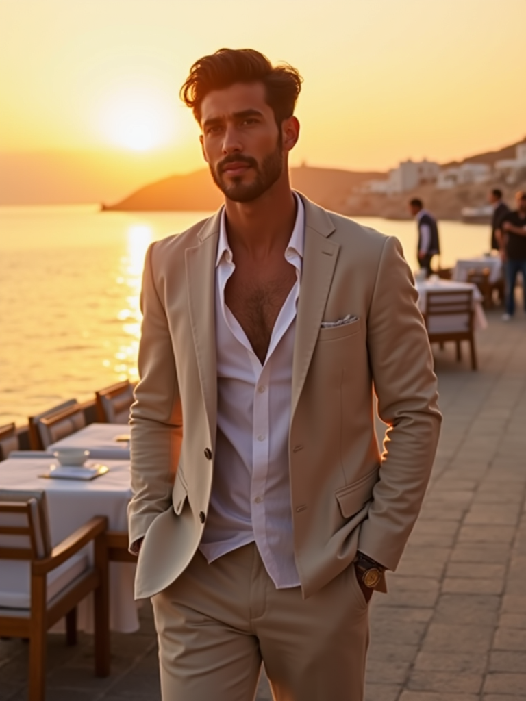 model enjoying sunset at Amoudi Bay, wearing smart casual outfit with linen blazer, golden hour lighting on seaside tavernas