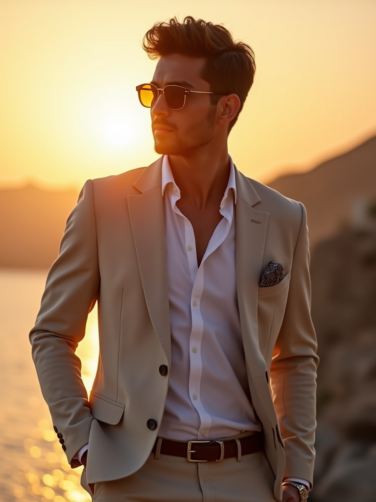 model enjoying sunset at Amoudi Bay, wearing smart casual outfit with linen blazer, golden hour lighting on seaside tavernas