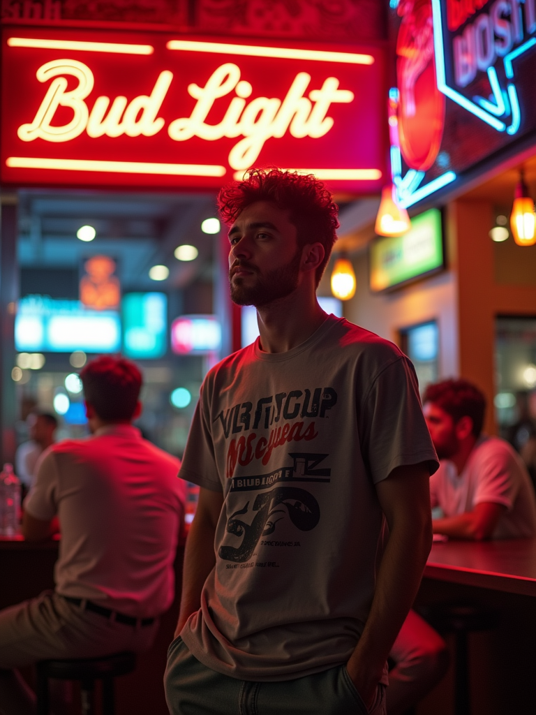 model exploring a lively dive bar in Las Vegas. at night. neon sign says "BUD LIGHT". the model wears a relaxed but fashionable outfit, like a graphic tee and chinos, with a playful and relaxed vibe.