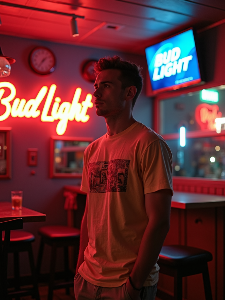 model exploring a lively dive bar in Las Vegas. at night. neon sign says "BUD LIGHT". the model wears a relaxed but fashionable outfit, like a graphic tee and chinos, with a playful and relaxed vibe.