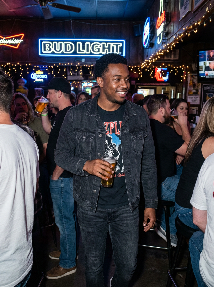 model exploring a lively dive bar in Las Vegas. at night. neon sign says "BUD LIGHT". the model wears a relaxed but fashionable outfit
