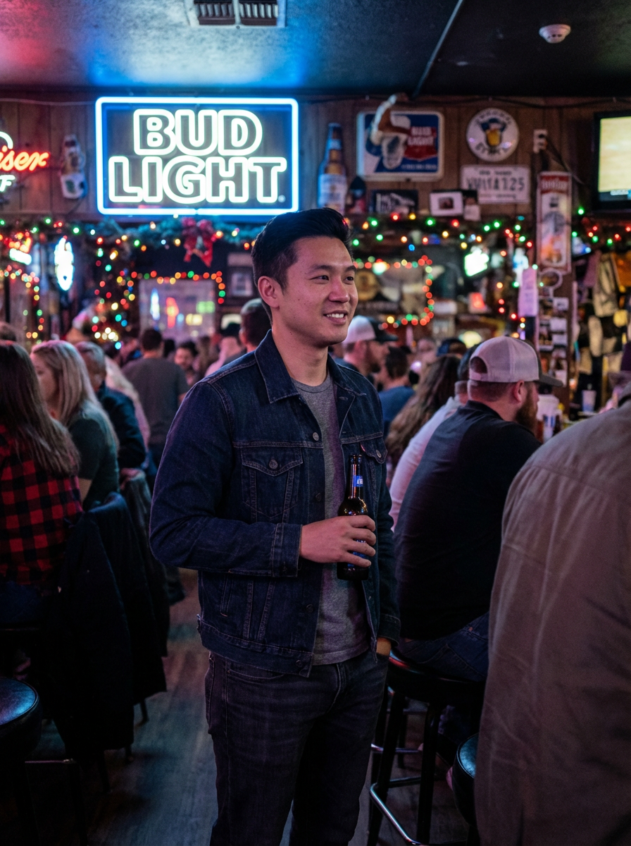 model exploring a lively dive bar in Las Vegas. at night. neon sign says "BUD LIGHT". the model wears a relaxed but fashionable outfit