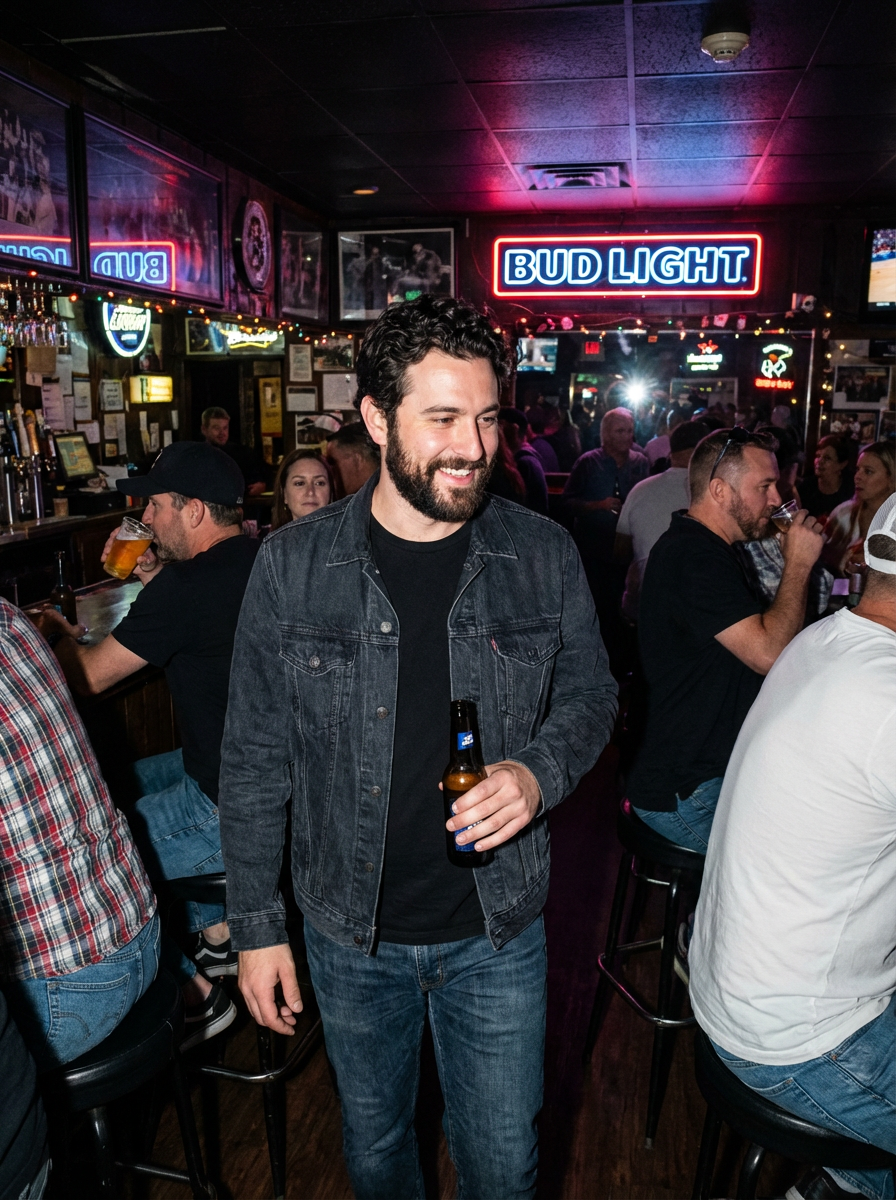 model exploring a lively dive bar in Las Vegas. at night. neon sign says "BUD LIGHT". the model wears a relaxed but fashionable outfit