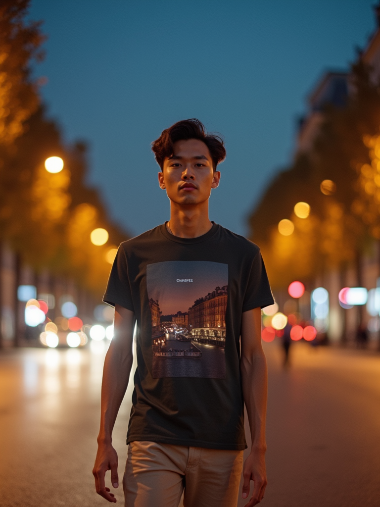 model exploring Champs-Élysées, wearing a stylish graphic tee and chino shorts, surrounded by city lights