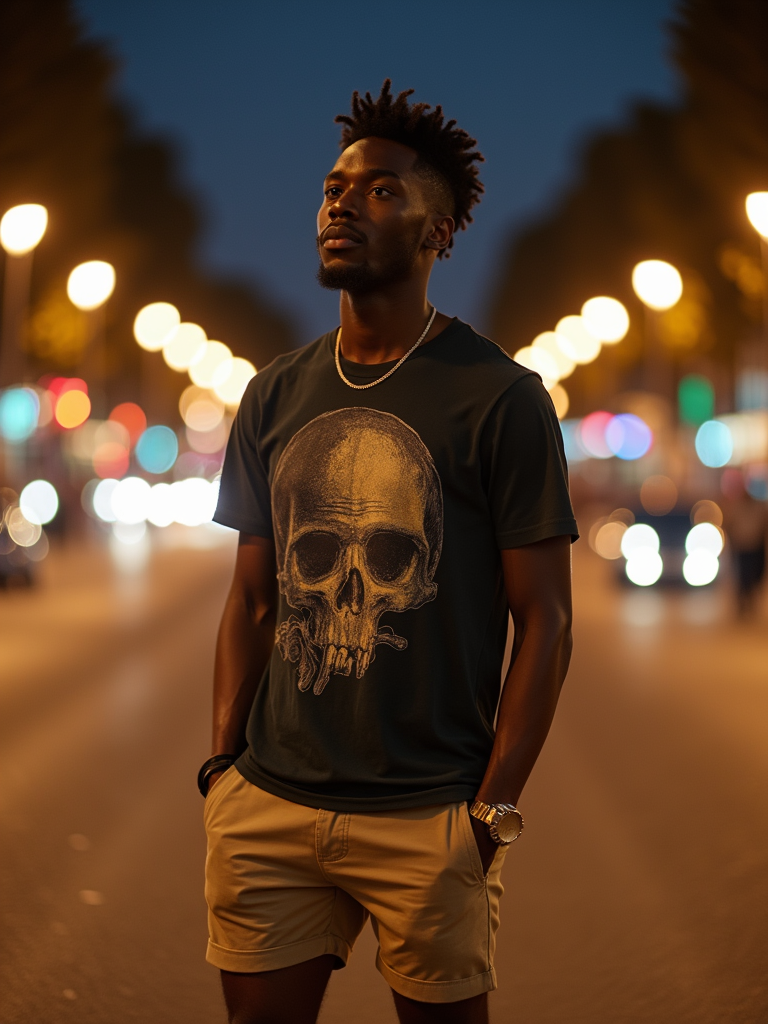 model exploring Champs-Élysées, wearing a stylish graphic tee and chino shorts, surrounded by city lights