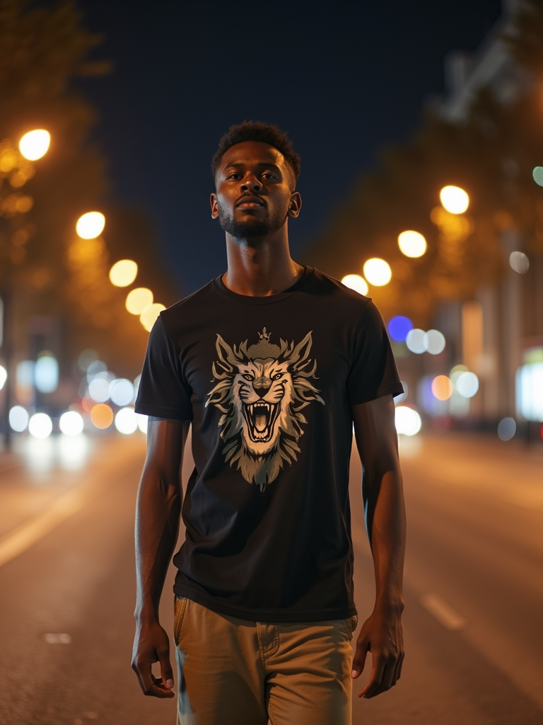 model exploring Champs-Élysées, wearing a stylish graphic tee and chino shorts, surrounded by city lights