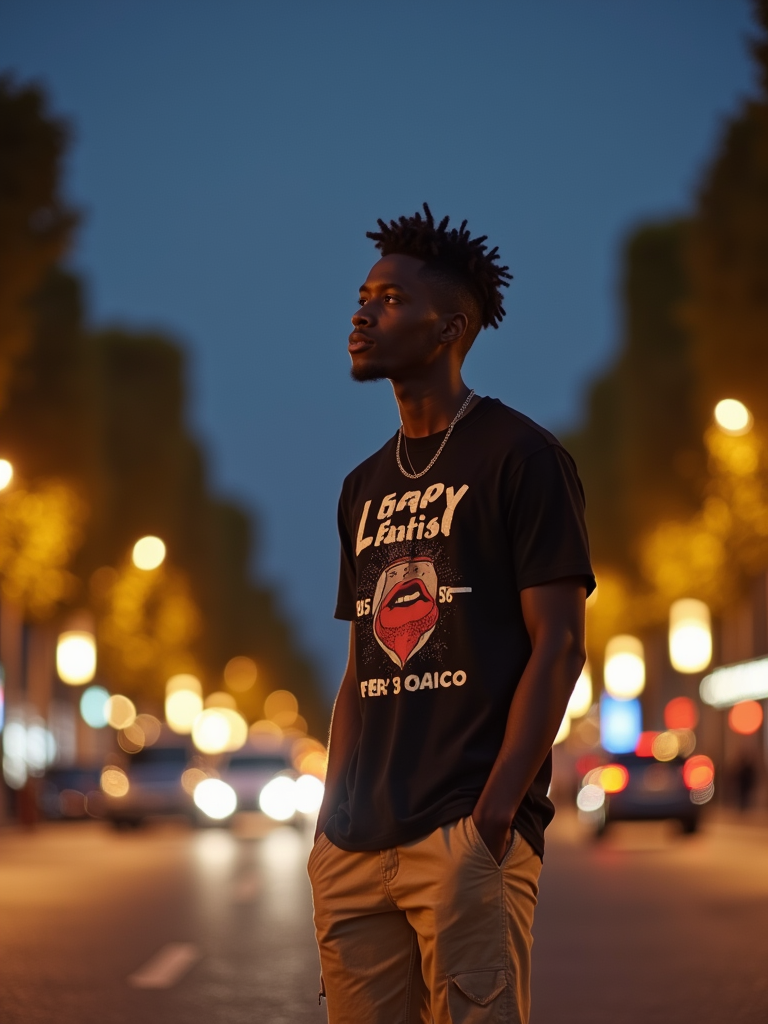 model exploring Champs-Élysées, wearing a stylish graphic tee and chino shorts, surrounded by city lights