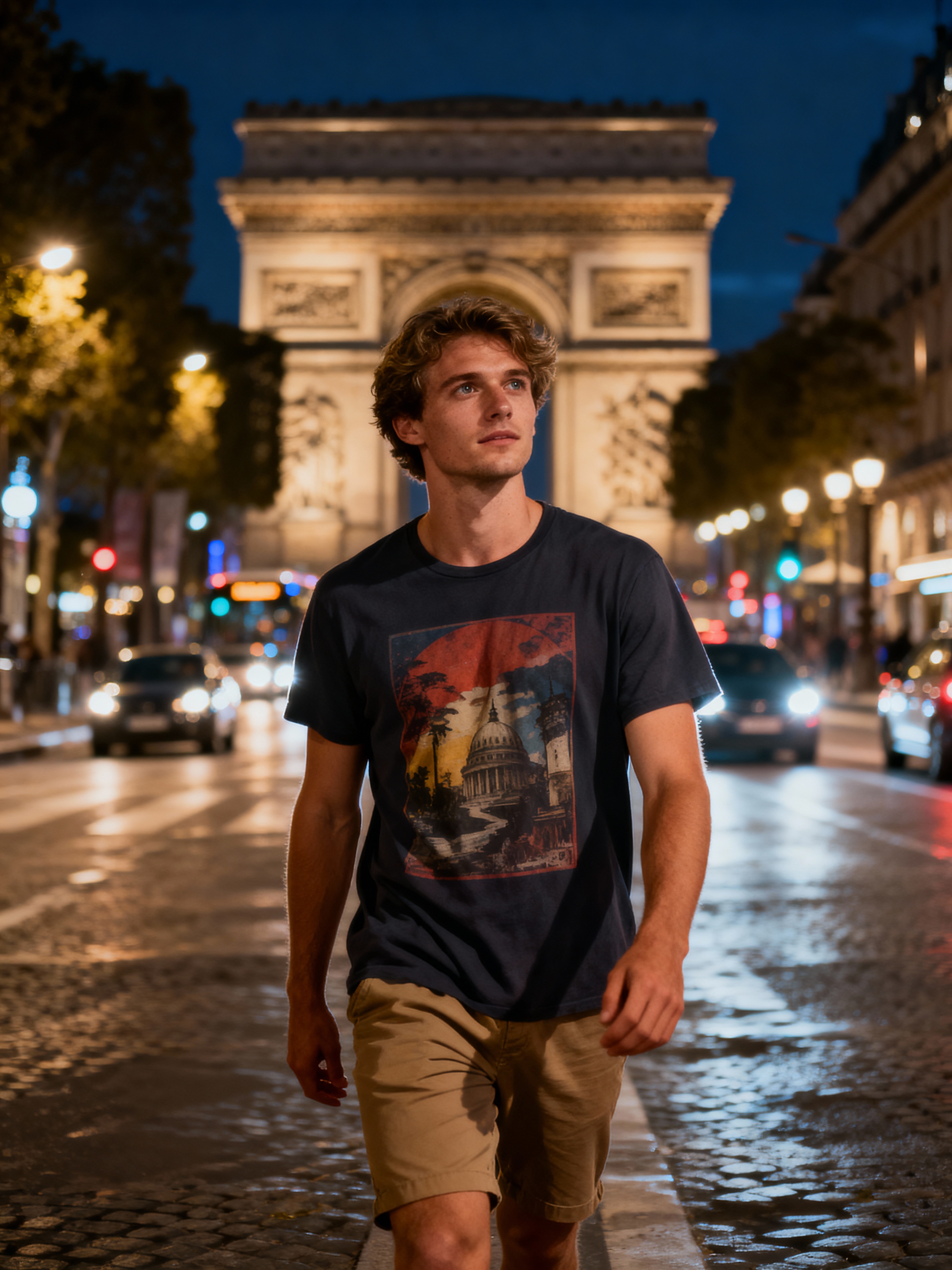 model exploring Champs-Élysées, wearing a stylish graphic tee and chino shorts, surrounded by city lights