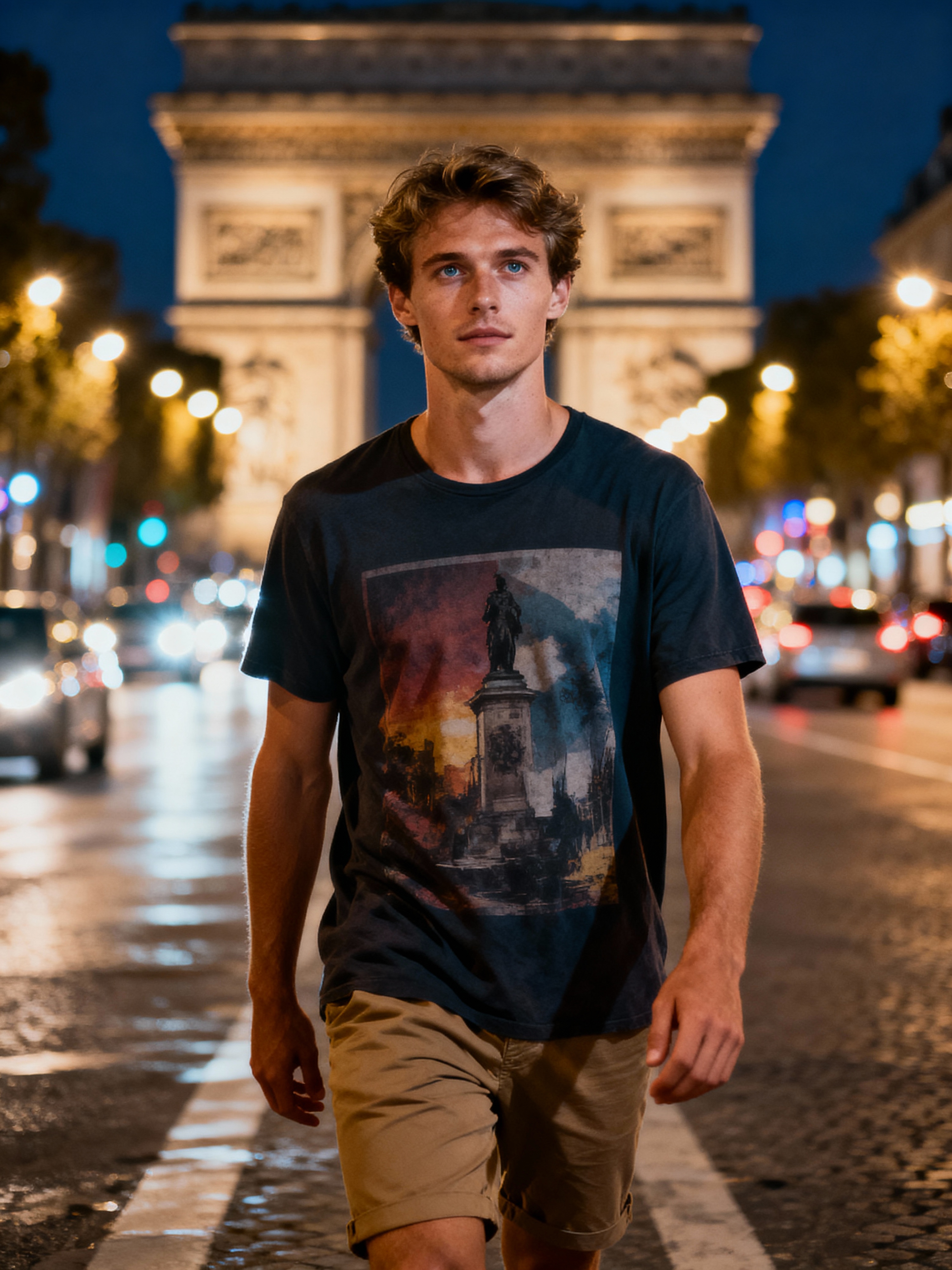 model exploring Champs-Élysées, wearing a stylish graphic tee and chino shorts, surrounded by city lights
