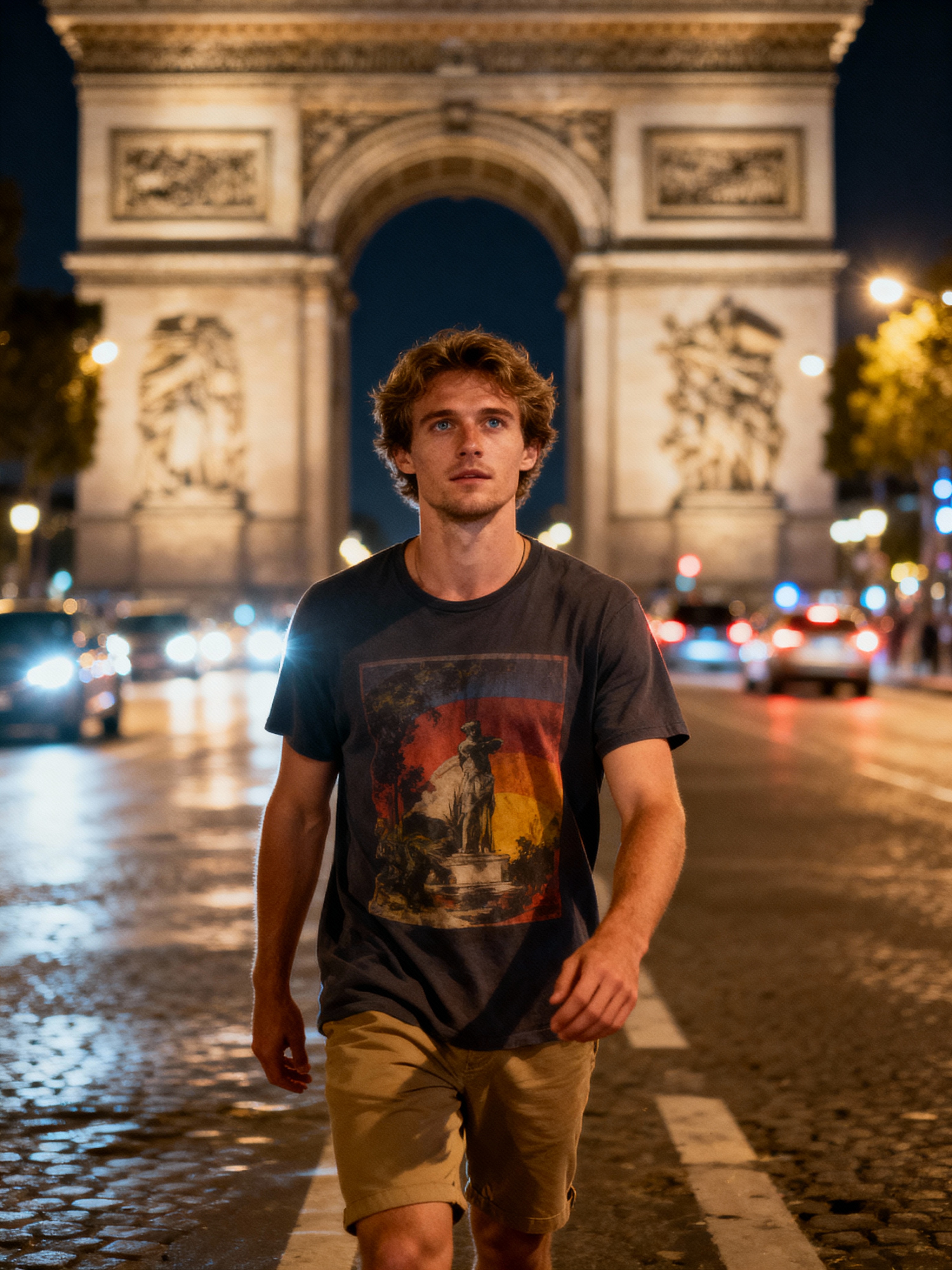 model exploring Champs-Élysées, wearing a stylish graphic tee and chino shorts, surrounded by city lights