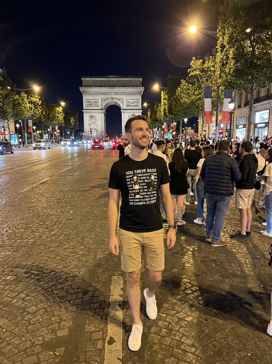 model exploring Champs-Élysées, wearing a stylish graphic tee and chino shorts, surrounded by city lights