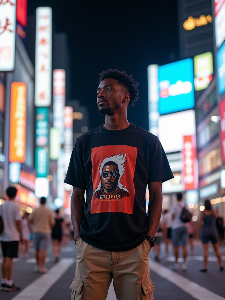 model exploring Shibuya Crossing, wearing a stylish graphic tee and chino shorts, surrounded by neon lights