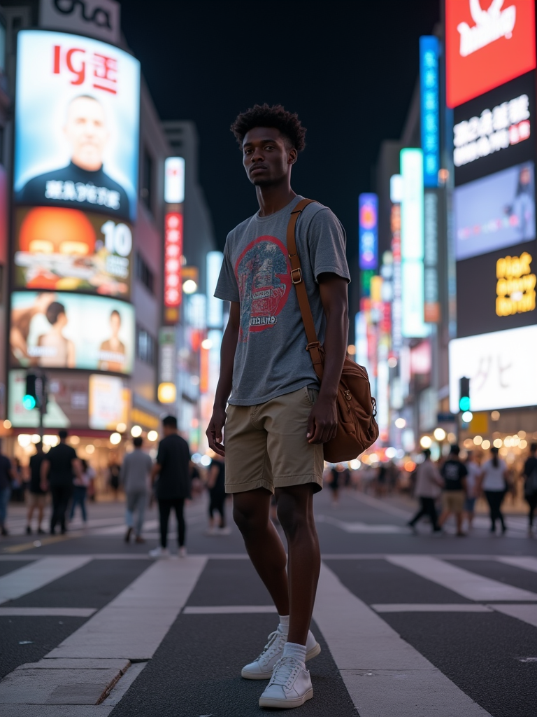 model exploring Shibuya Crossing, wearing a stylish graphic tee and chino shorts, surrounded by neon lights