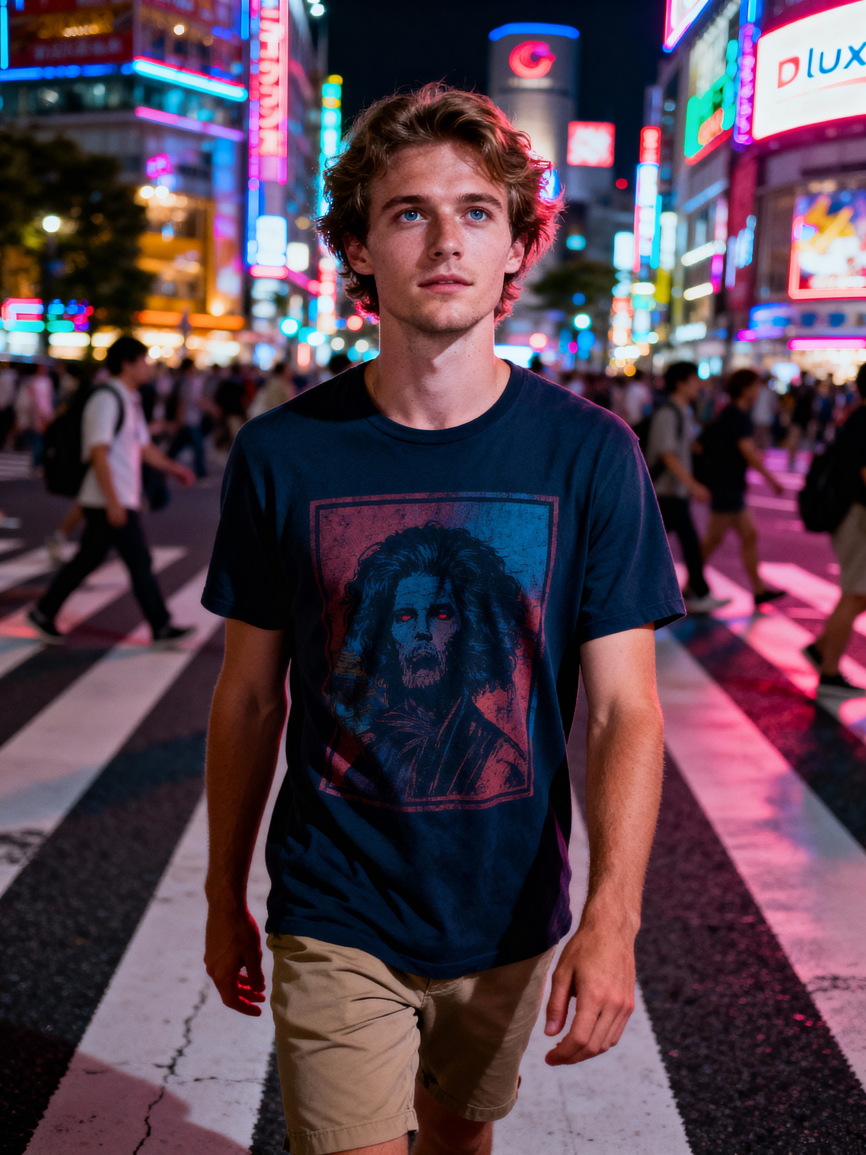 model exploring Shibuya Crossing, wearing a stylish graphic tee and chino shorts, surrounded by neon lights
