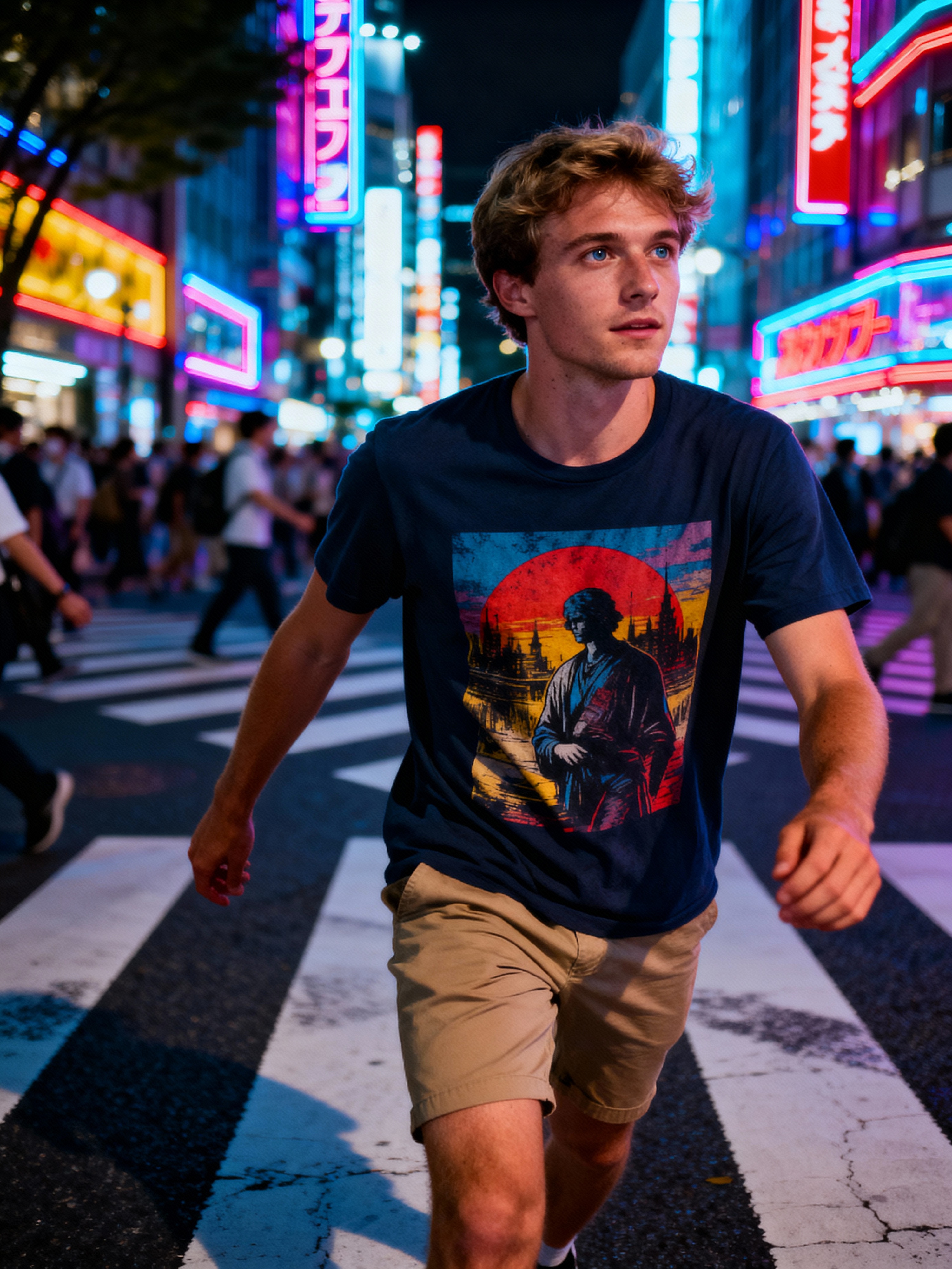 model exploring Shibuya Crossing, wearing a stylish graphic tee and chino shorts, surrounded by neon lights