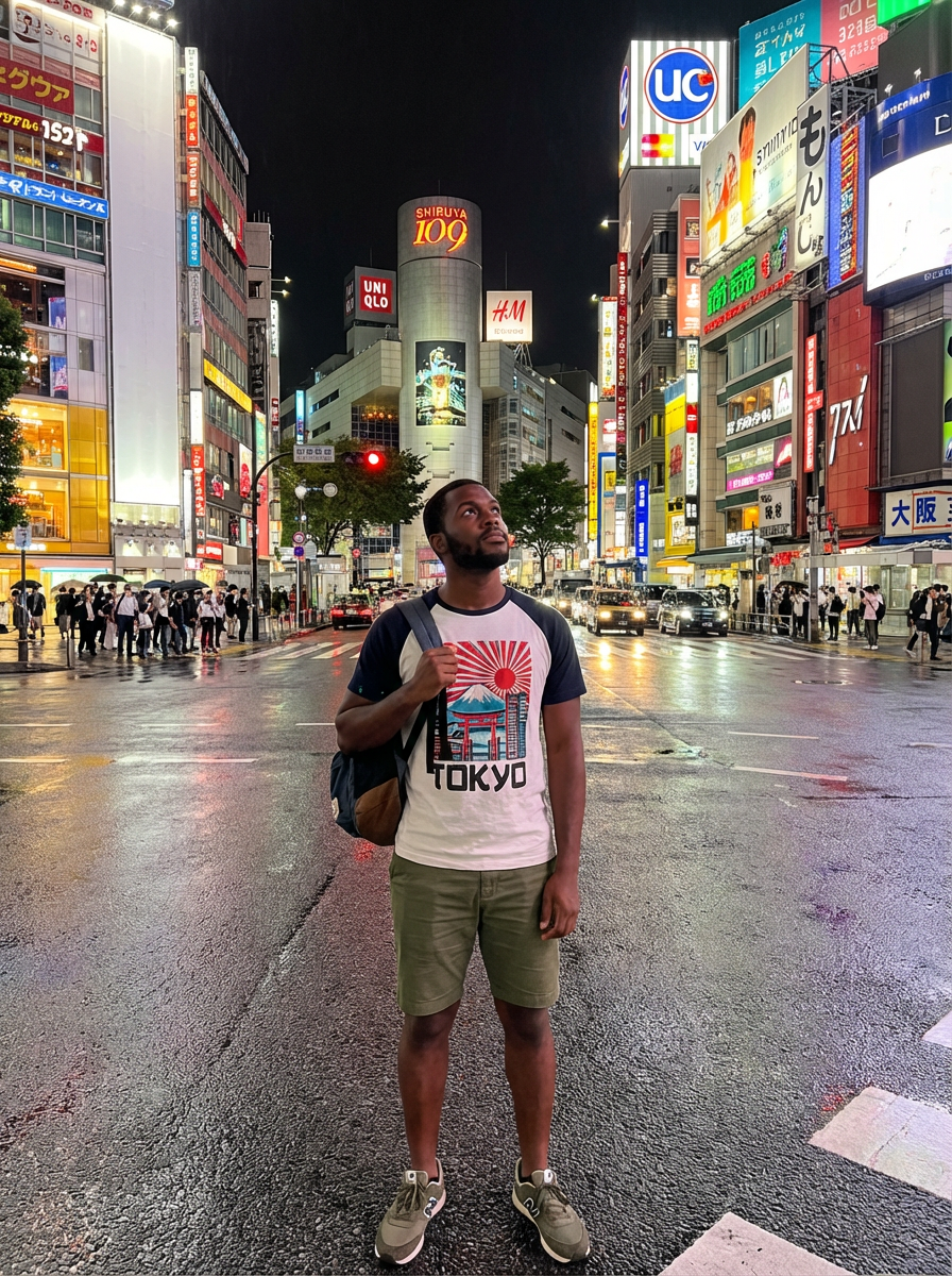 model exploring Shibuya Crossing, wearing a stylish graphic tee and chino shorts, surrounded by neon lights