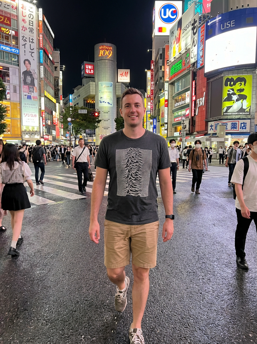 model exploring Shibuya Crossing, wearing a stylish graphic tee and chino shorts, surrounded by neon lights