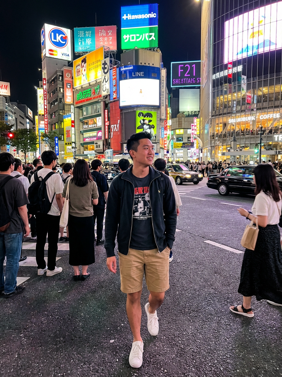 model exploring Shibuya Crossing, wearing a stylish graphic tee and chino shorts, surrounded by neon lights