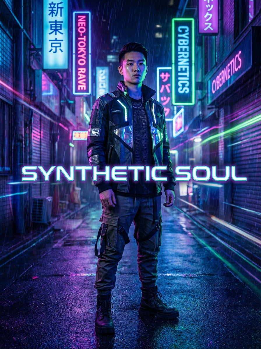 model for electronic music cover, futuristic aesthetic, neon lights, cyberpunk influence, modern edgy